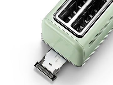 The slide-out crumb tray behind the toaster can be easily removed to clean.