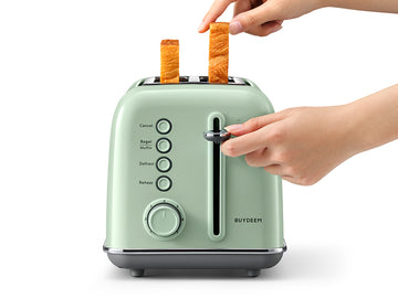 Kickstart a day with perfect breads from BUYDEEM retro 2-slice metal toaster which is featured extra-wide slots toast different bagels and muffins. And dual independent control can fulfill different tastes at the same time.